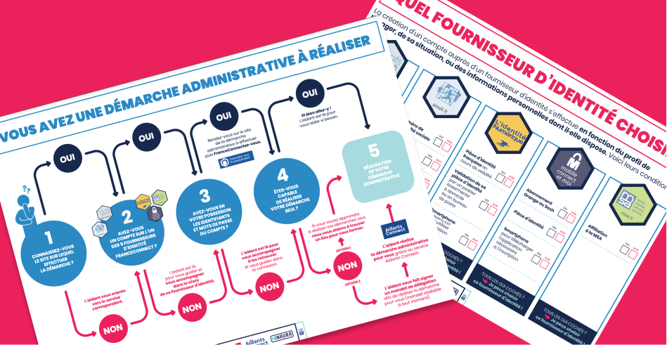 Les outils de médiation ont donc été conçus de manière particulièrement facilitante. Ils consistent en des fiches très pédagogiques à base de schémas, d’arbres décisionnels qui sont montrés par les aidants numériques aux publics qu’ils rencontrent afin de mieux cerner leurs besoins et de mieux les accompagner.