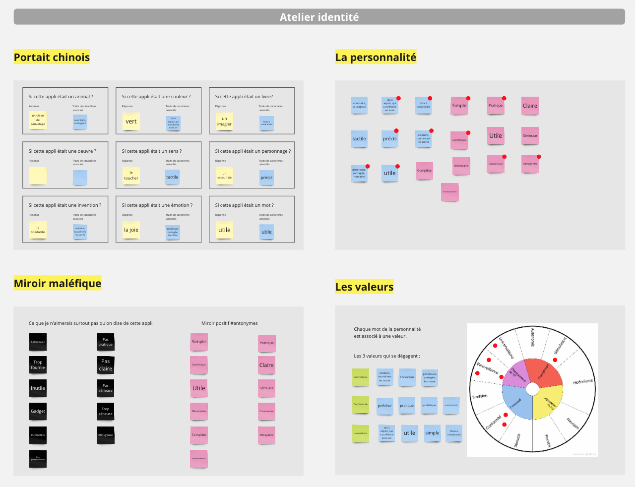 Je définis l’identité graphique du projet. Pour m’aider, je réalise un atelier d’identité afin de dégager la personnalité de mon produit, ses valeurs, et ce que je ne veux surtout pas qu’on en dise.