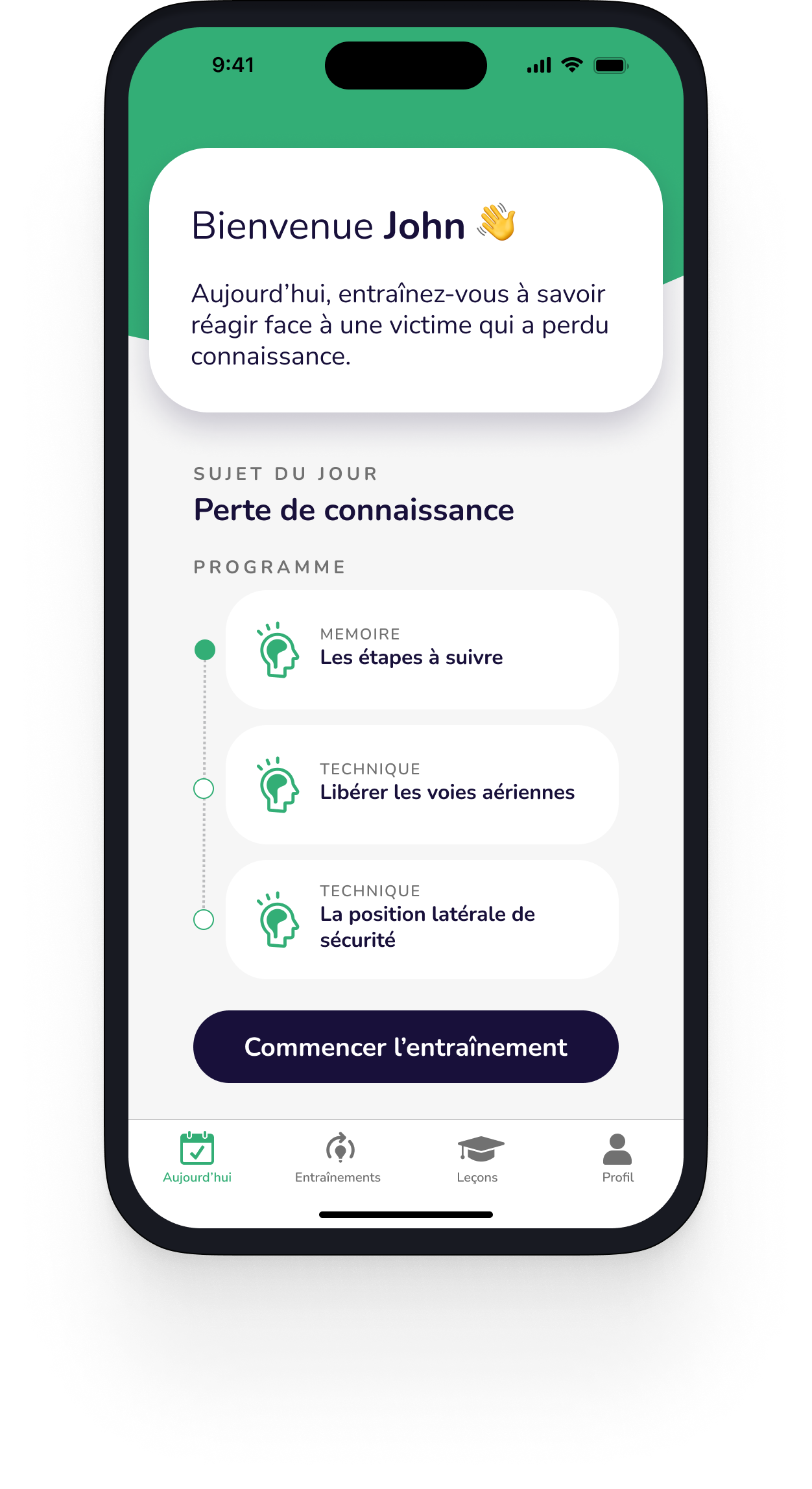 Il reçoit des rappels réguliers pour suivre un programme personnalisé en fonction de ses priorités (ex : connaître les gestes à effectuer sur les nourrissons).