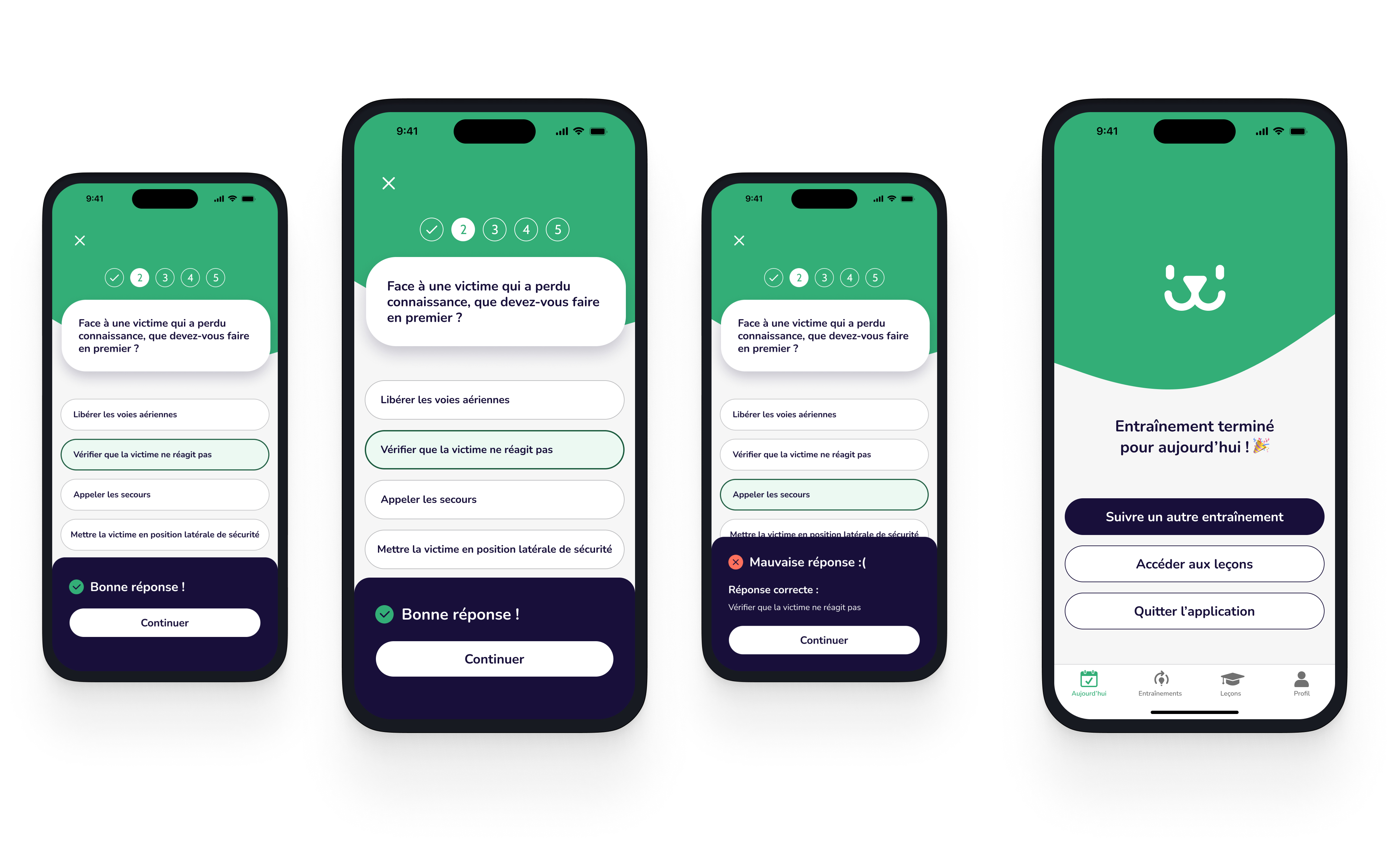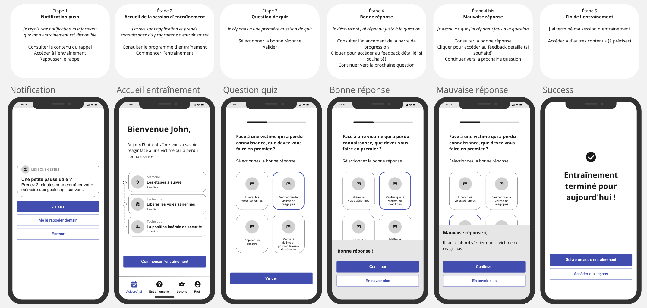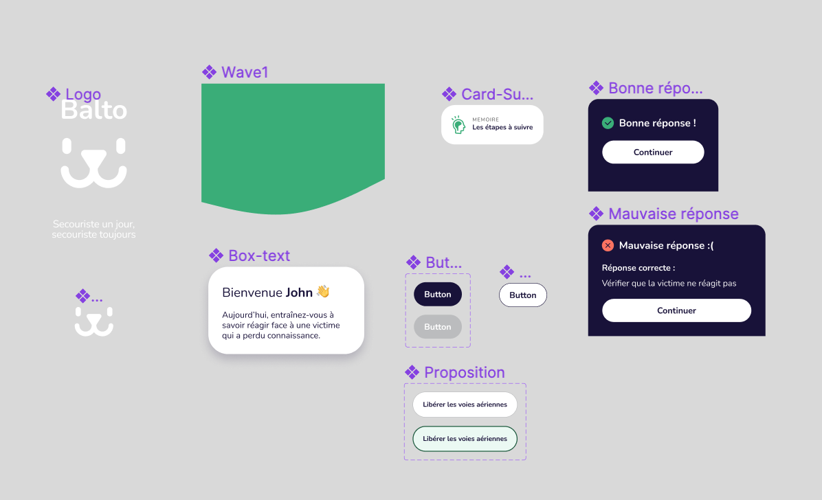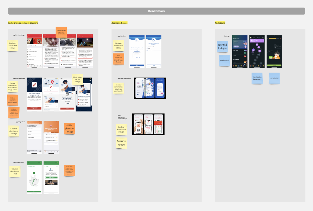 Je commence par un rapide benchmark qui me permet d’identifier qu’il n’existe pas d’application qui répond à l’objectif de Balto. Les applications de premiers secours sont peu ludiques, peu modernes. Je décide d’aller s’inspirer du côté des appli pédagogiques telles que Duolingo.