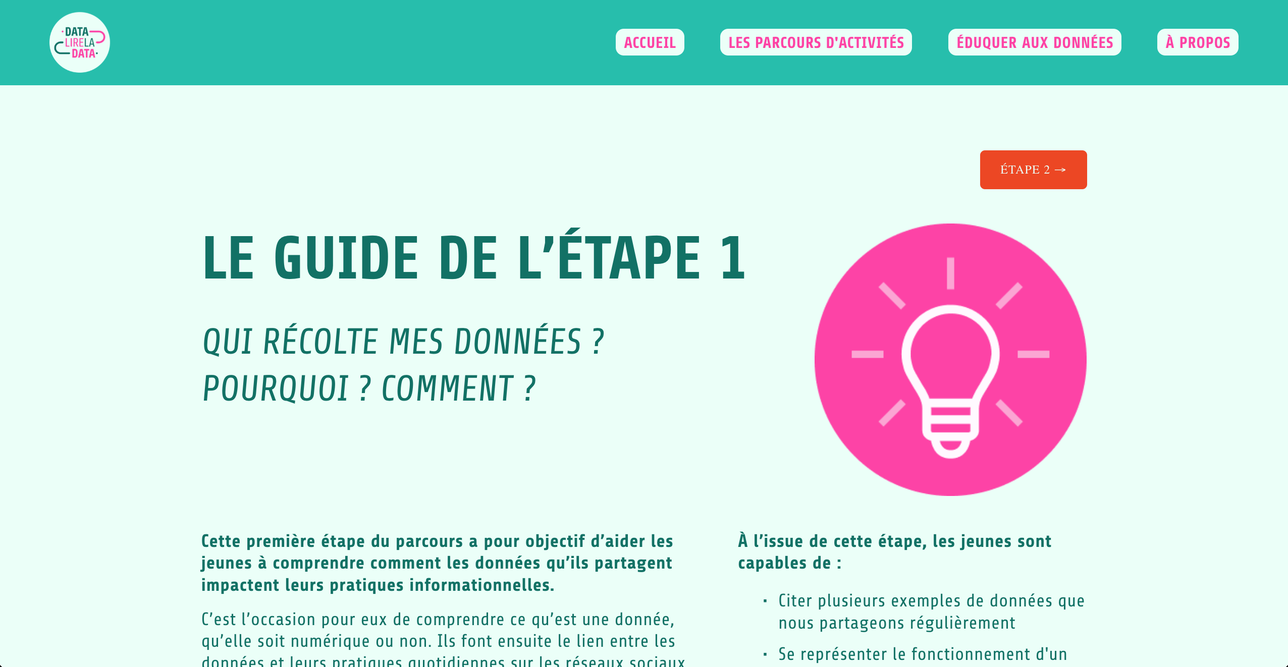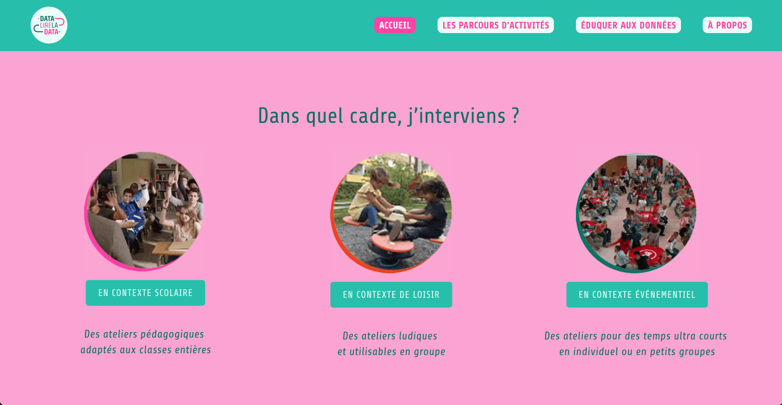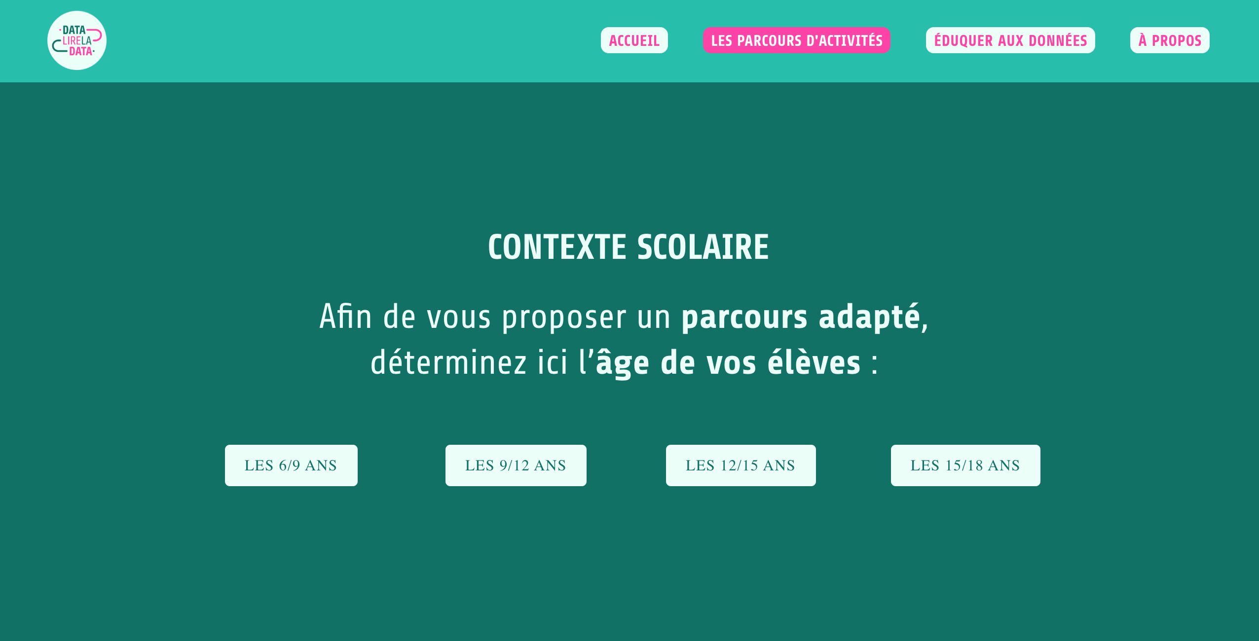Pour répondre à ce problème, j’ai piloté au sein de Fréquence écoles le développement d’une plateforme éducative : Datalireladata. L’objectif de Datalireladata est d’accompagner les professionnels de l’éducation à éduquer les jeunes aux données.